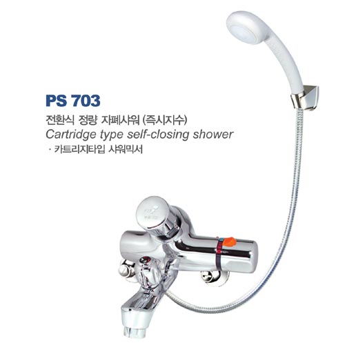 ps703 모델은 전환식(샤워해드 및 수도꼭지 전환 밸브) 정량자폐 (5초에서 50초 사이 정해진 시간동안 물이 나오다가 자동으로 잠기게 되어 절수 되는 제품입니다.